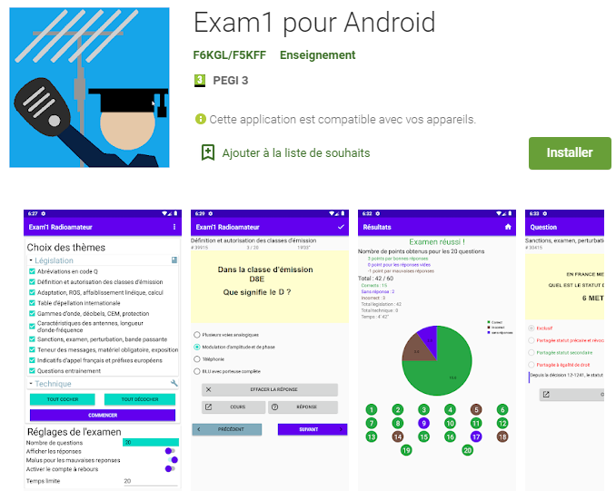 L’application est disponible sur GooglePlay sous le nom « Exam1 pour android » (version 0.5-beta) et édité par le radio-club F6KGL/F5KFF : https://play.google.com/store/apps/details?id=dev.favier.exam1radioamateur N’hésitez pas à laisser une note, cela aide à la promotion de l’application et à un meilleur référencement (l’application est encore très loin dans la liste et il faut « scroller » pour la trouver sans passer par le lien).