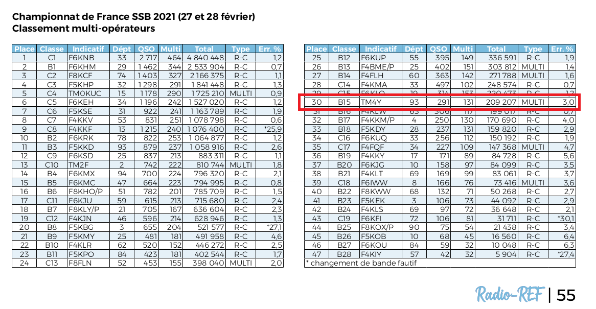Enfin, le résultat final, après décompte des erreurs dans la saisie du log, est paru dans Radio-REF de mai 2021. Le score a été corrigé à la marge (291 contacts ont été retenus), nous plaçant en 15ème position du groupe B (stations dont la puissance est comprise entre 5 et 100 watts).