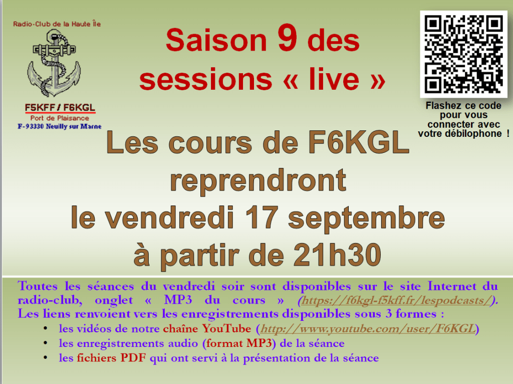 D’autre part, le document « Cours de F6KGL » a été mis à jour et est disponible au téléchargement à partir de ce lien : http://f6kgl.f5kff.free.fr/cours_radio.pdf . Pour ceux qui auraient déjà la version de février 2021, il n’y a pas de modification majeur par rapport à cette version.