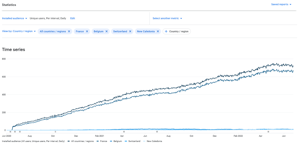 Pour la version Android, il s’agit du nombre d’appli installées depuis la mise en ligne sur GooglePlay en juin 2020 (déduction faite des applis désinstallées) : à ce jour, la console GooglePlay nous en annonce un peu plus de 700 ! Mais on ne sait pas si ces applis sont utilisées ni qui les utilise. En revanche, ce que l’on sait (et ce n’est pas surprenant), c’est que les installations sont téléchargées depuis la France métropolitaine (à un peu plus de 92%). Viennent ensuite la Belgique et la Suisse avec, pour chaque pays, un peu plus de 1,5% du total des téléchargements. La Nouvelle Calédonie et la Martinique sont respectivement en 4ème et 5ème position.