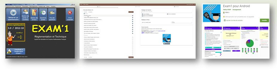 Une version FULL WEB d’Exam’1 a été développée par Valentin F4HVV. Cette version fonctionne avec tous les navigateurs et n’installe rien sur votre PC hormis l’historisation de vos scores et des questions sur lesquelles vous souhaitez revenir (sauf si vous supprimez l’historique de navigation…).
