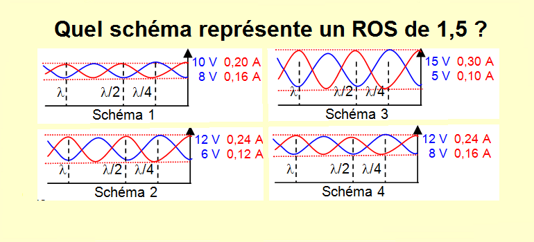 Corrigé : les schémas représentent les courbes des valeurs efficaces constatées U et I dans un câble en fonction de la distance par rapport à la charge. Ainsi, un ROS de 1,5 dans un câble de 50 ohms pourrait donner des valeurs U et I au niveau de la charge de 12 V et 0,16 A (soit 75 ohms, d’où ROS = 1,5) et, à un quart d’onde de la charge : 8 V et 0,24 A. Dans ce cas, le courant incident (émis) a pour valeur 10 V et 0,2 A (50 ohms) et le courant réfléchi mesure 2 V et 0,04 A (encore 50 ohms). C’est la superposition de ces deux courants de sens contraire qui forme les ondes stationnaires