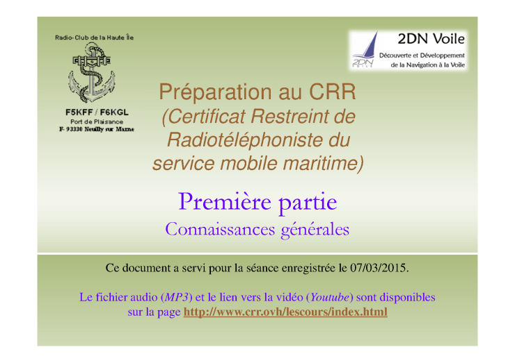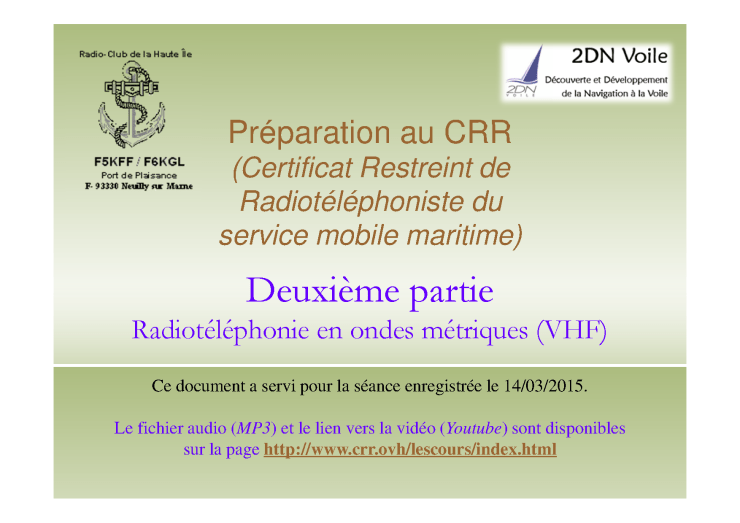 Le radio-club de Neuilly sur Marne, F5KFF-F6KGL, s’associe à 2DN Voile pour préparer les candidats au Certificat Restreint de Radiotéléphoniste (CRR) qui autorise l’utilisation d’une VHF ASN dans de nombreux pays étrangers (En France, l’obtention du permis de conduire des navires de plaisance donne une équivalence au CRR mais ce n’est pas le cas partout…).