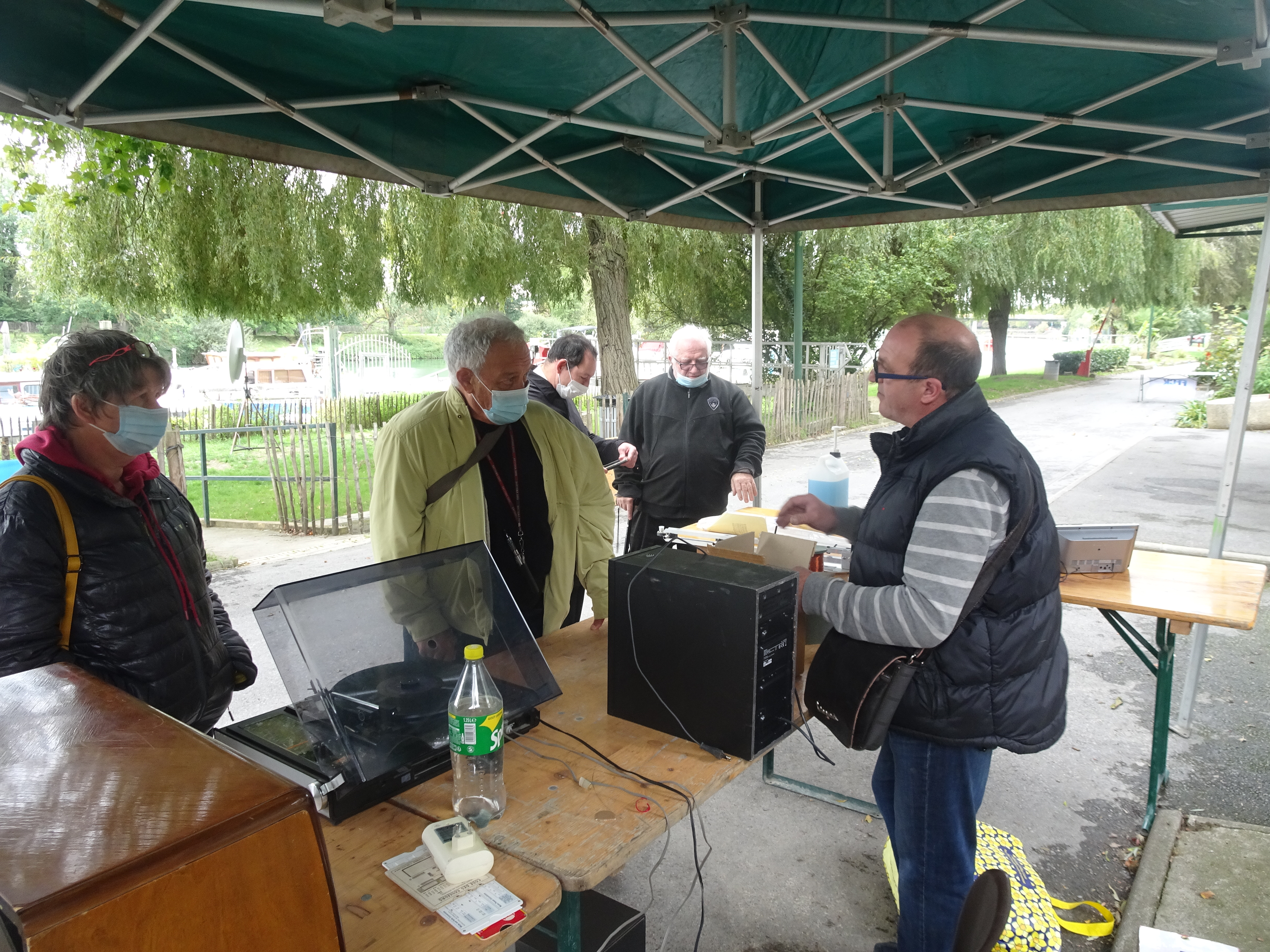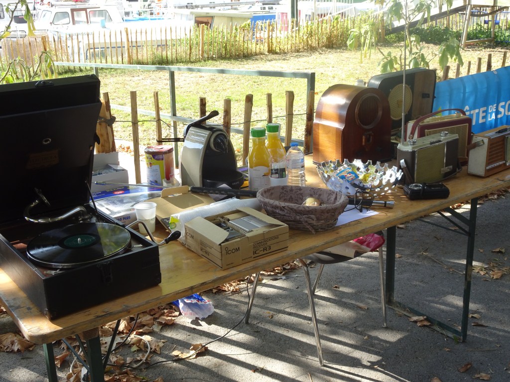 Dès le matin, 13 exposants avaient aligné leur matériel sur plus de 20 tables (certes, ce n’est pas énorme mais ça augmente d’année en année…). Comme tous les ans, nous avions convoqué le soleil. Il n’est arrivé que vers 10h00 après dissipation des brumes matinales, comme on l’entend souvent dans les bulletins météo du mois d’octobre. Près d’une centaine de visiteurs ont arpenté la promenade piétonne, le long des bords de Marne, que la Ville de Neuilly sur Marne nous avait autorisée à investir. A ces visiteurs informés par les différents messages qui avaient circulé dans les revues et les forums Internet, il faut ajouter les promeneurs de passage et les joggeurs étonnés de voir tant de gens autour de vieux matériels et de caisses de composants inconnus à leurs yeux. Ce fut l’occasion de faire de la promotion pour les activités du radio-club situé à proximité et, peut-être, de susciter des vocations…