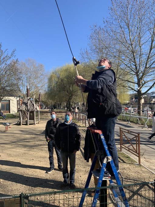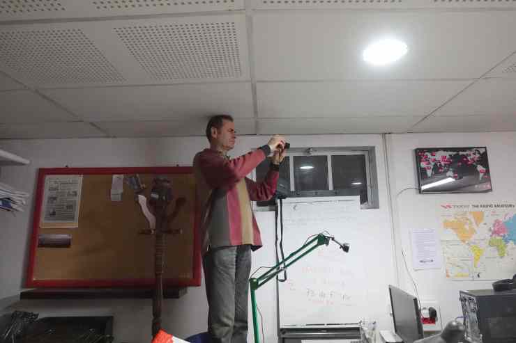 Jean-Luc F6GPX monte à l’assaut du pylône. Pendant ce temps, Patrice F4HPW et Michel F4GJN préparent le câble qui servira d’antenne verticale tandis qu’Andrea reconstruit la prise de terre qui laissait à désirer. Enfin, Didier F4DFR assure l’intendance au sol (qui a oublié la clé de 13 ou le petit tournevis cruciforme ?) et vérifie au fur et à mesure le bon réglage de l’installation (il faut raccourcir le brin de 10 cm !).
