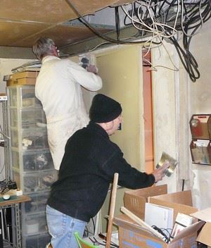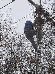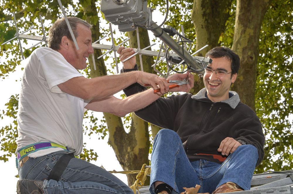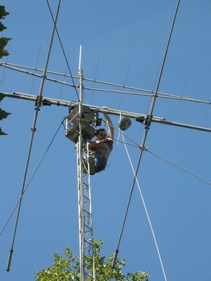 Philippe F6GIG et Didier F4DFR font chauffer le fer à souder tandis Michel F4GJN, armé d’une scie, élague un arbre trop expansif. Pendant ce temps, Jean-Luc F6GPX joue au singe en haut du pylône.