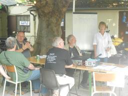 Au fond : YL de SWL Eric, Louis F1BGV, Stéphane F0DZO. A droite : Didier F0FDR, SWL Eric, Claude F4DVN (de dos), Oliver F4FLF.