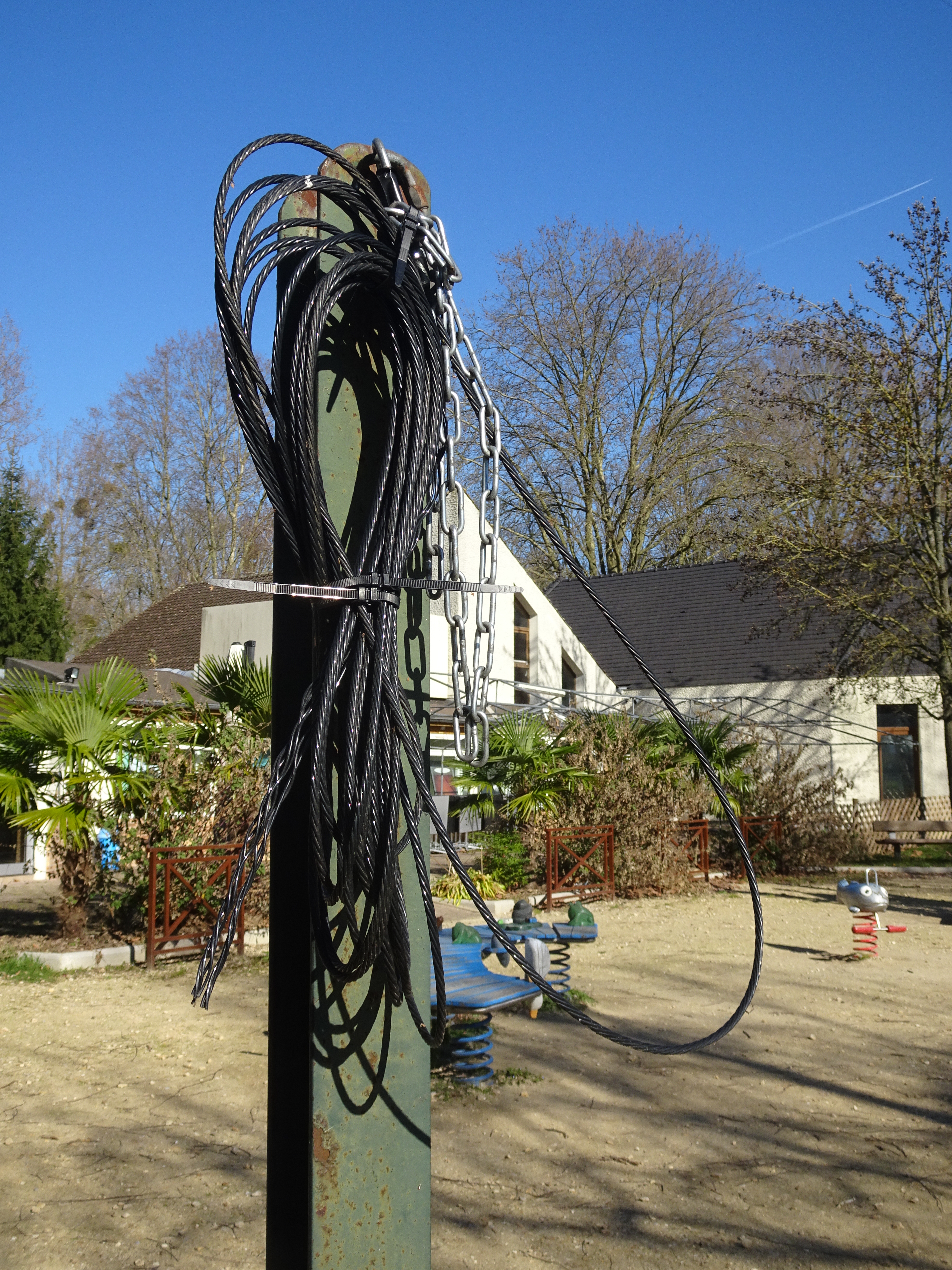 Tout d’abord, il fallait compléter l’installation déjà en place avec un brin vertical pour le 40 mètres fixé en haut du pylône par un câble en kevlar. On en a profité pour ajouter une roulette et une drisse pour monter temporairement et facilement un dipôle ou autre antenne horizontale.