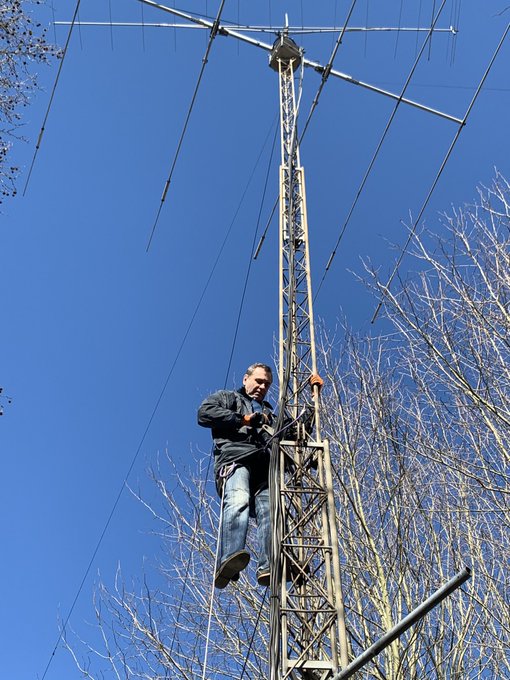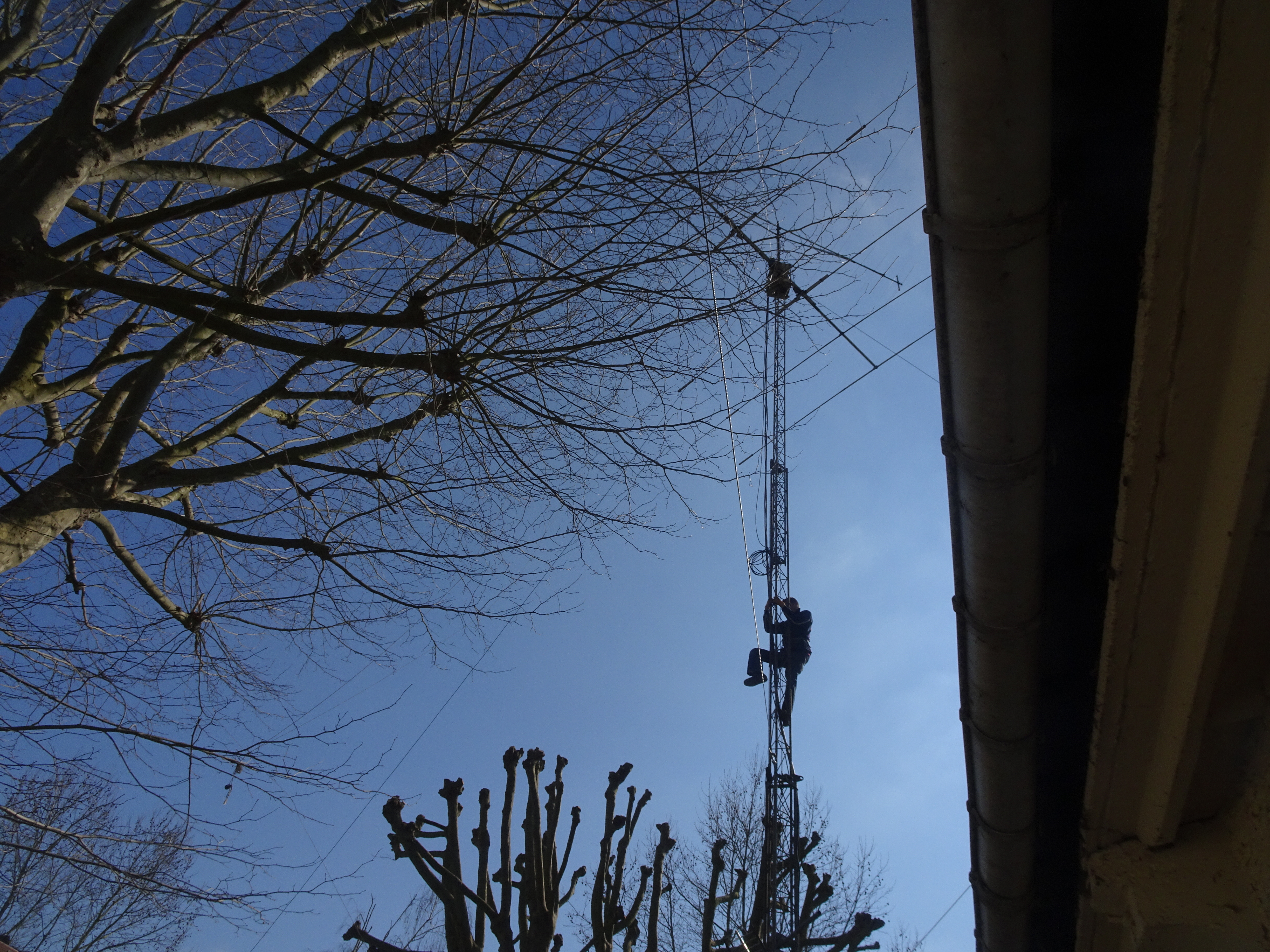 Le samedi 20/02 au matin, une nouvelle fois, une équipe est venue au radio-club pour finaliser le montage des antennes verticales 40 et 80 mètres. La météo était plutôt clémente : quelques gouttes de pluie à l’arrivée (nous nous étions donnés rendez-vous à 10h00) et qui n’ont pas duré. Tant mieux car il y avait du travail à faire sur le toit et sur le pylône…