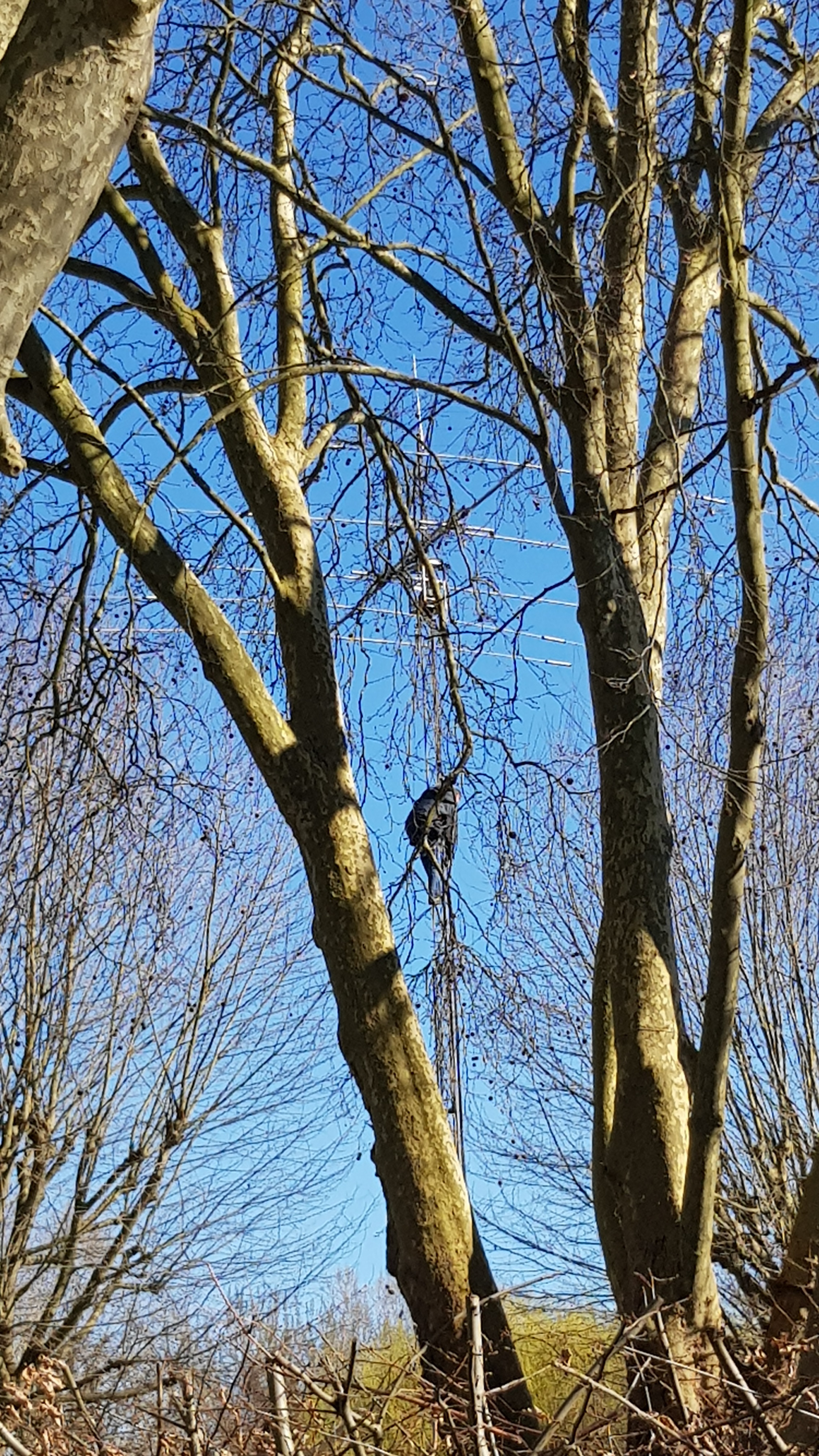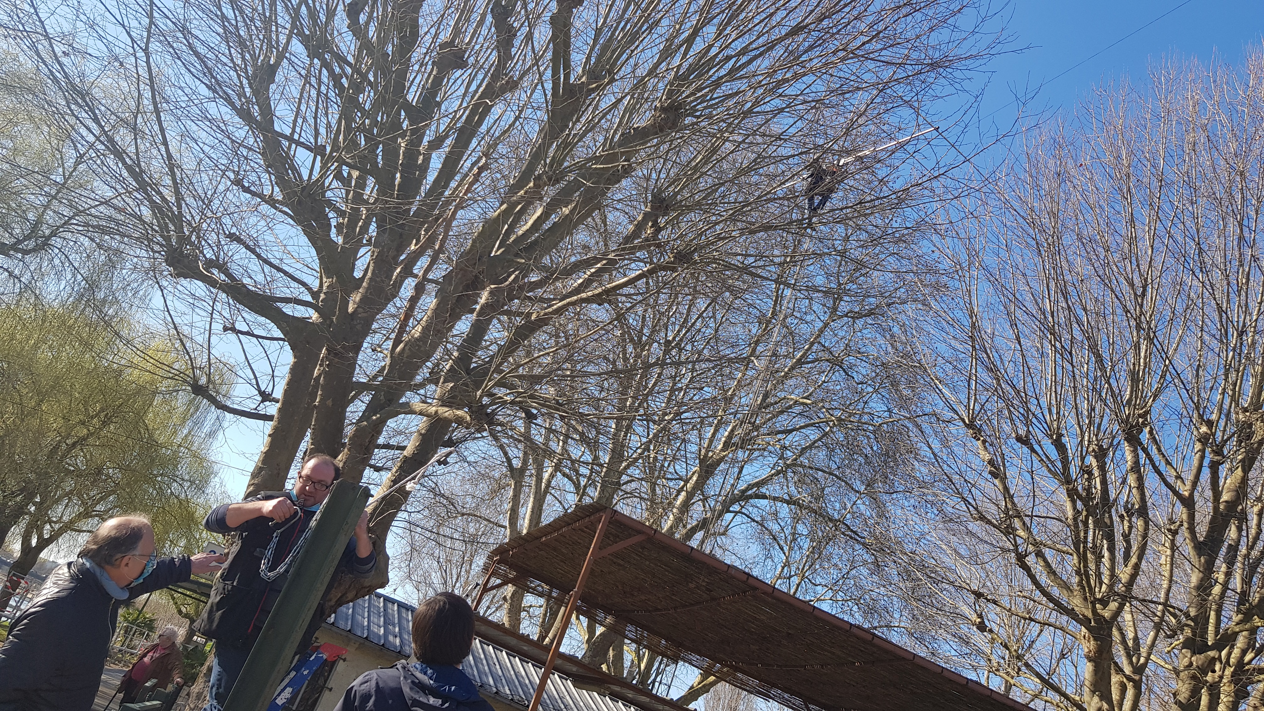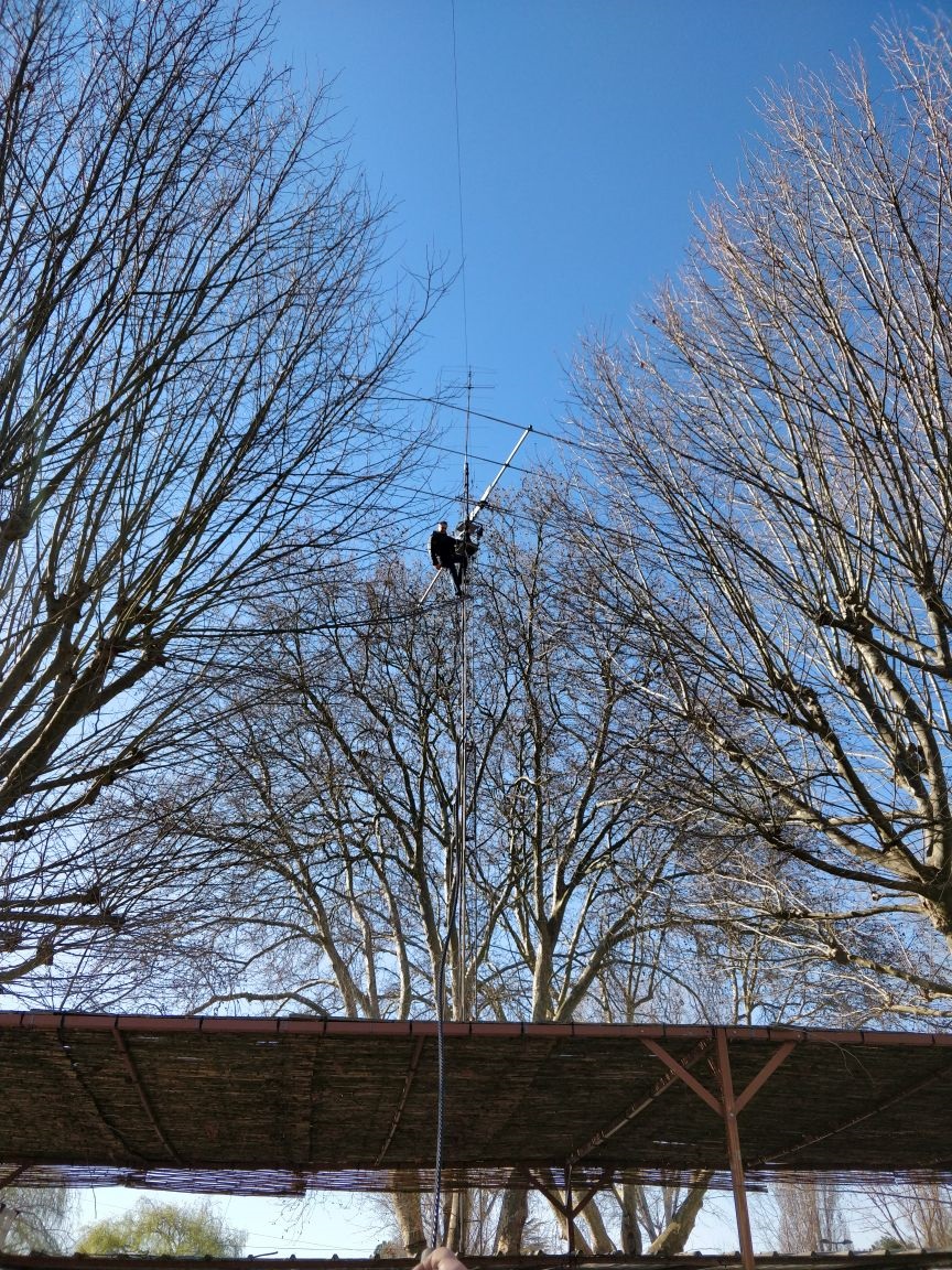 Élagage des arbres afin de dégager le pylône support de l’antenne verticale HF où seront installées l’antenne 50 MHz et les antennes croisées pour le trafic via satellite. Louis F1BGV, Philippe F6GIG, Hervé F5GGU et Michel F4DLL ont bravé le froid pendant deux jours pour mener à bien cette tâche. Au premier coup de tronçonneuse, les services municipaux sont arrivés et nous ont aidés à faire la « coupe de printemps » aux deux arbres qui gênaient le plus.