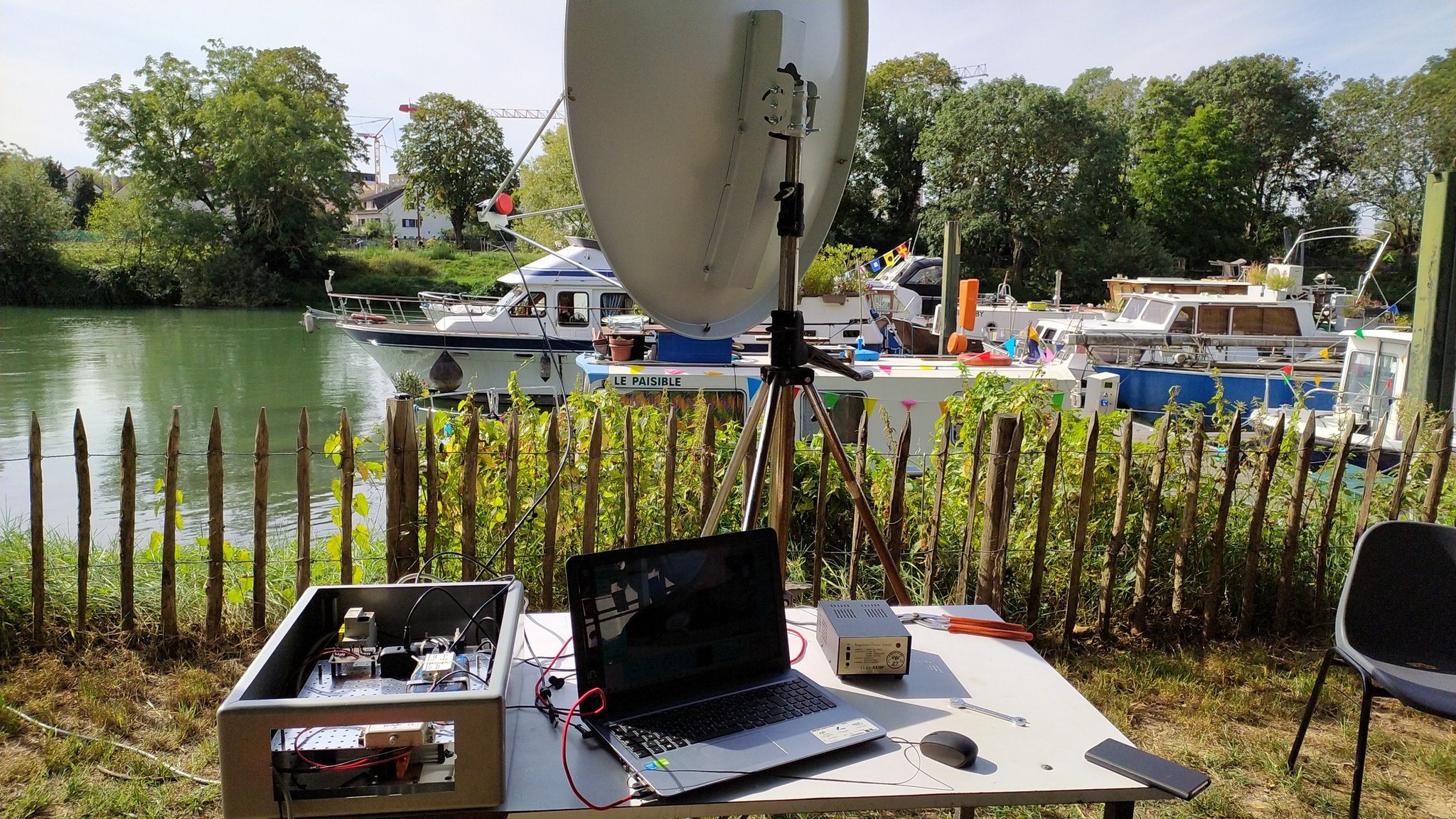 Un des ateliers installé le long de la promenade (« d’où viennent cette QSL ? » et recherche de radio-sonde) et, en bord de Marne, installation de la parabole QO100 (1,20 mètre de diamètre) par quatre de nos membres. Enfin, l’atelier « découverte de l’électricité » présentait une pile de Volta (Zinc / Cuivre) fabrication maison et des jeux de construction de circuits électriques : pile, interrupteur, lampe, moteur, diode. Les jeunes enfants et leurs parents ont apprécié cette animation proposée par Karim, chacun redoublant d’idées pour compliquer le circuit !
