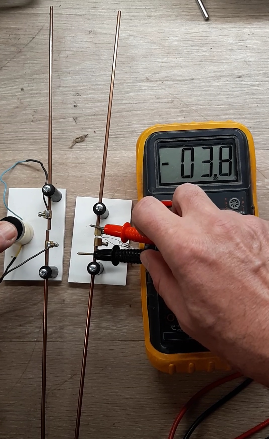 Jean Luc F6GPX avait préparé une expérience : un voltmètre de fabrication maison (électrodes zinc-cuivre baignant dans du vinaigre blanc dilué à 3° avec 1% de gros sel) permettait d’allumer une petite LED rouge et de faire dévier l’aiguille d’une boussole (vers la gauche en regardant le fil de la bobine dans le sens du courant)