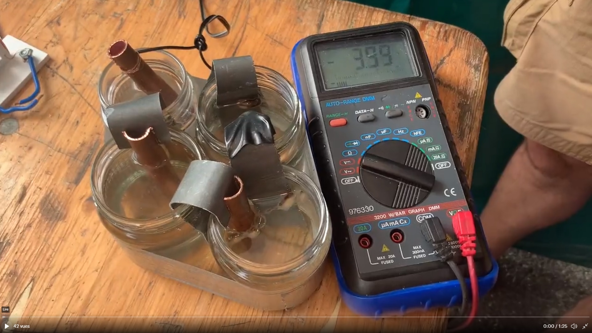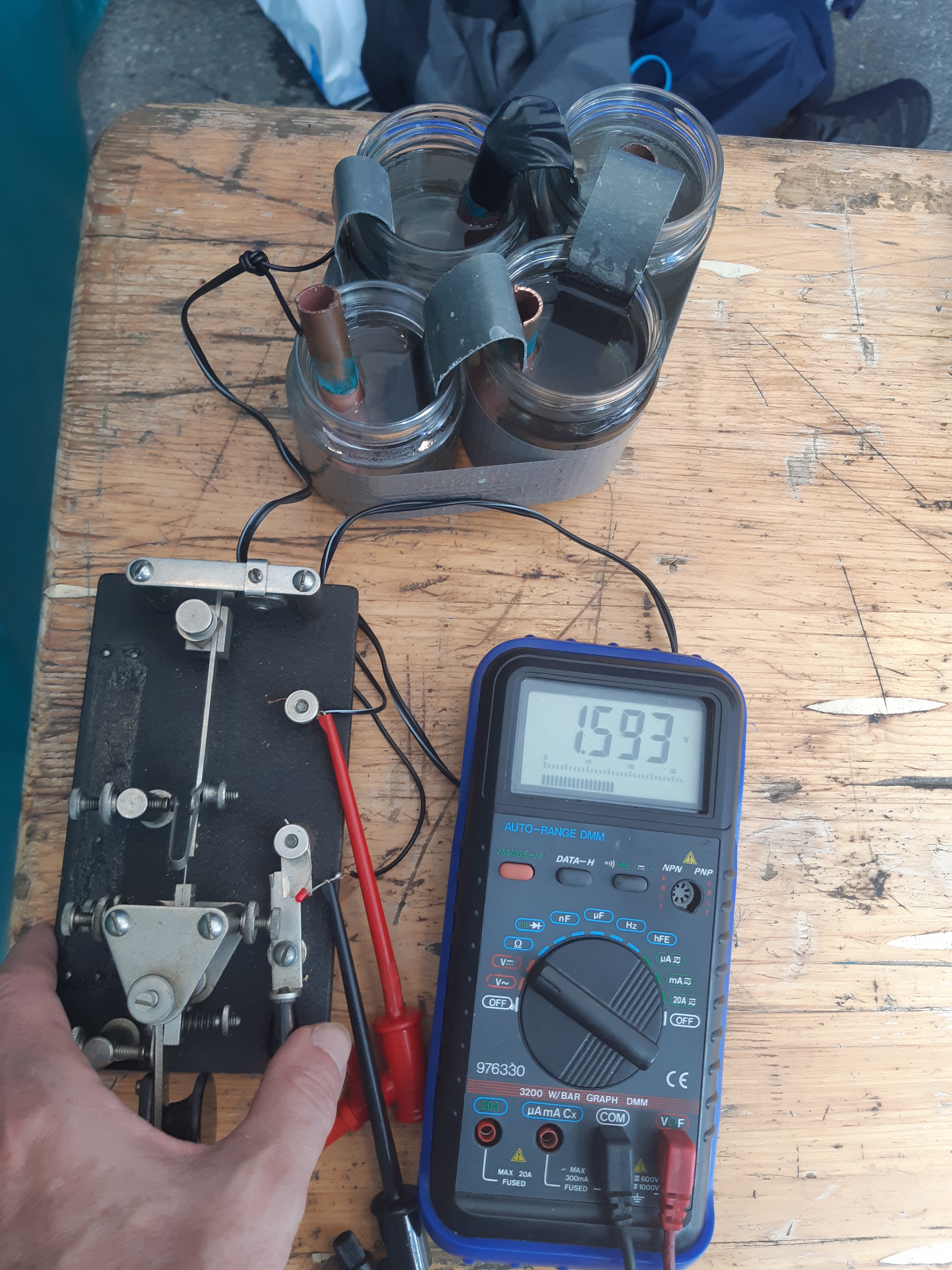 - pile de Volta (électrodes zinc-cuivre dans du vinaigre blanc dilué à 3% et salé)