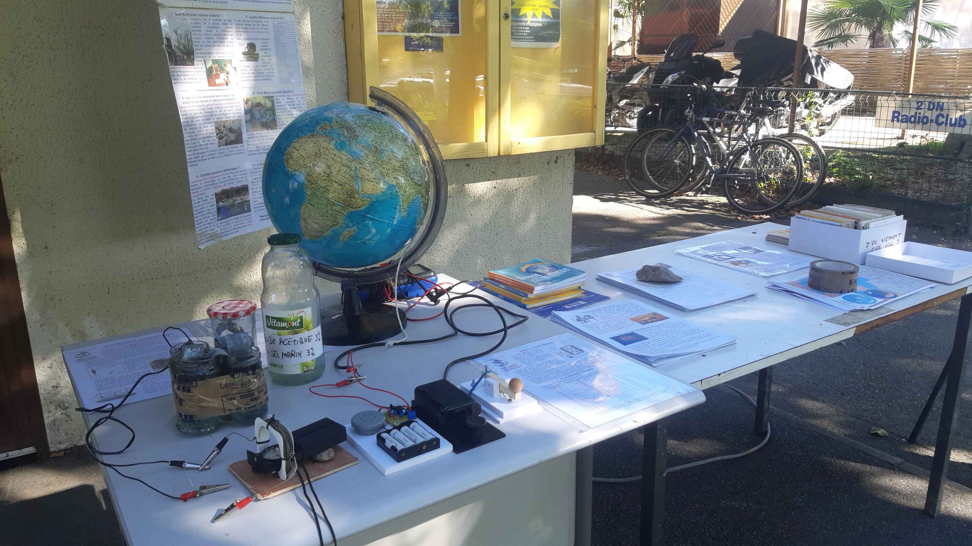 Pour l’occasion, nous avions mis l’accent sur les expériences en direct avec une collection de talkies-walkies et de petits appareils et la présentation d’une pile Zinc-Cuivre (pile de Volta) qui délivrait fièrement 1 volt par élément et qui permettait d’alimenter une LED. Celle-ci faisait chuter sévèrement la tension de la pile, signe que la résistance interne de celle-ci était non négligeable (la mesure nous a montré une intensité de court-circuit de la pile égale à 9 mA, soit une résistance interne de 450 ohms environ). Sans compter, comme toujours, l’atelier morse, l’animation « d’où vient cette QSL ? » et la chasse à la radio-sonde en région parisienne.