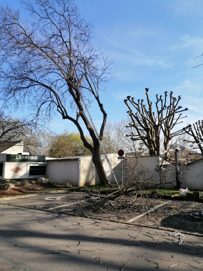 Armés d’une échelle triple (juste assez grande…) et d’une tronçonneuse électrique, nous avons coupé la branche gênante puis nous l’avons débité en bûches de 50 cm et autre petit bois. Nous avons dû attendre le départ d’une voiture garée juste sous l’arbre avant de commencer l’opération.