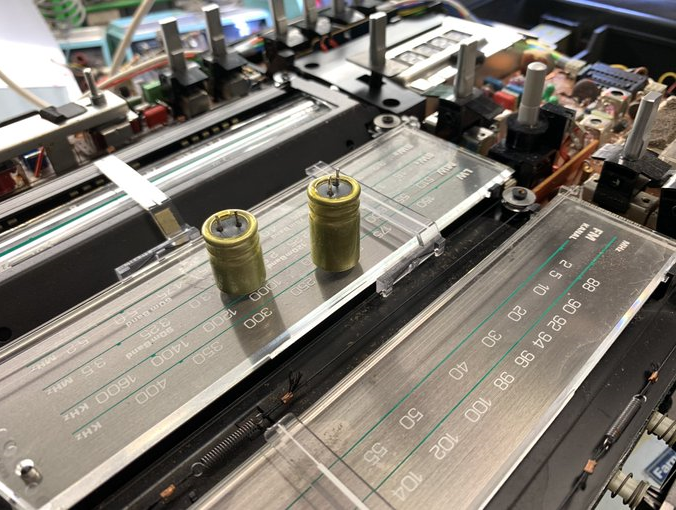 Les deux condensateurs chimiques responsables d’une des pannes de l’appareil En espérant que ces quelques images vous inciteront à pousser la porte du radio-club un de ces samedis