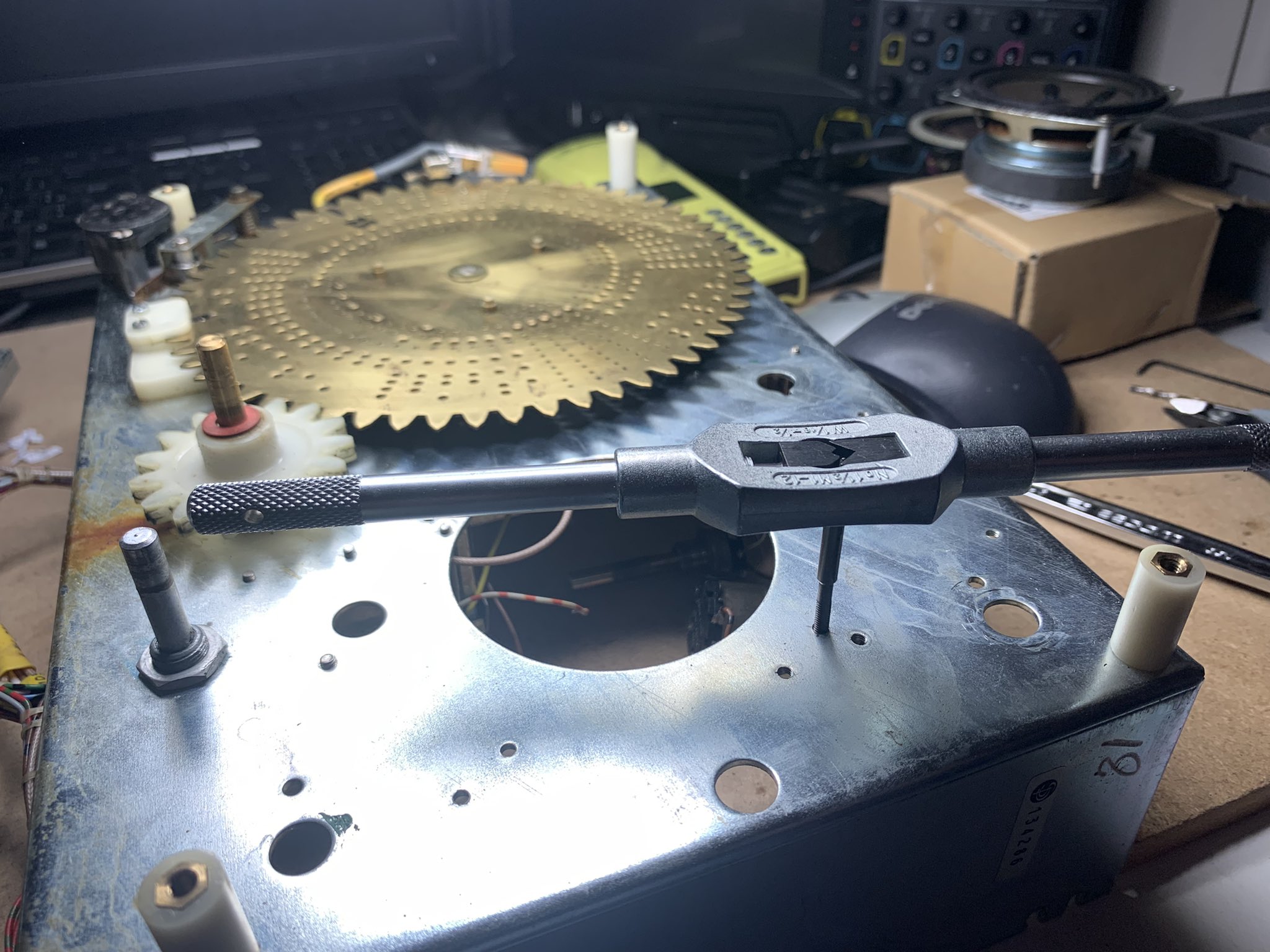 Pour finir, en janvier 2022, nouvel appel de Mario : cette fois-ci, c’est le haut parleur qui rend l’âme. Heureusement c’est plus facile à réparer ! Comme on n’a pas trouvé dans notre stock le haut parleur strictement identique, il a fallu bricoler : un taraud M3 pour adapter les trous du nouvel HP. Ah oui … et quatre petits condensateurs électrolytiques changés sur l’ampli BF. Ca marche bien maintenant !