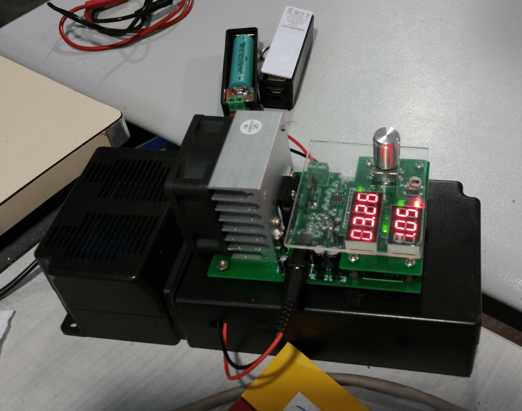 mode charge ou décharge.Le microcontrôleur affiche courant /tension/charge acquise (mAH). Les valeurs sont stockées en EEPROM (24LC256) pour être restituées en